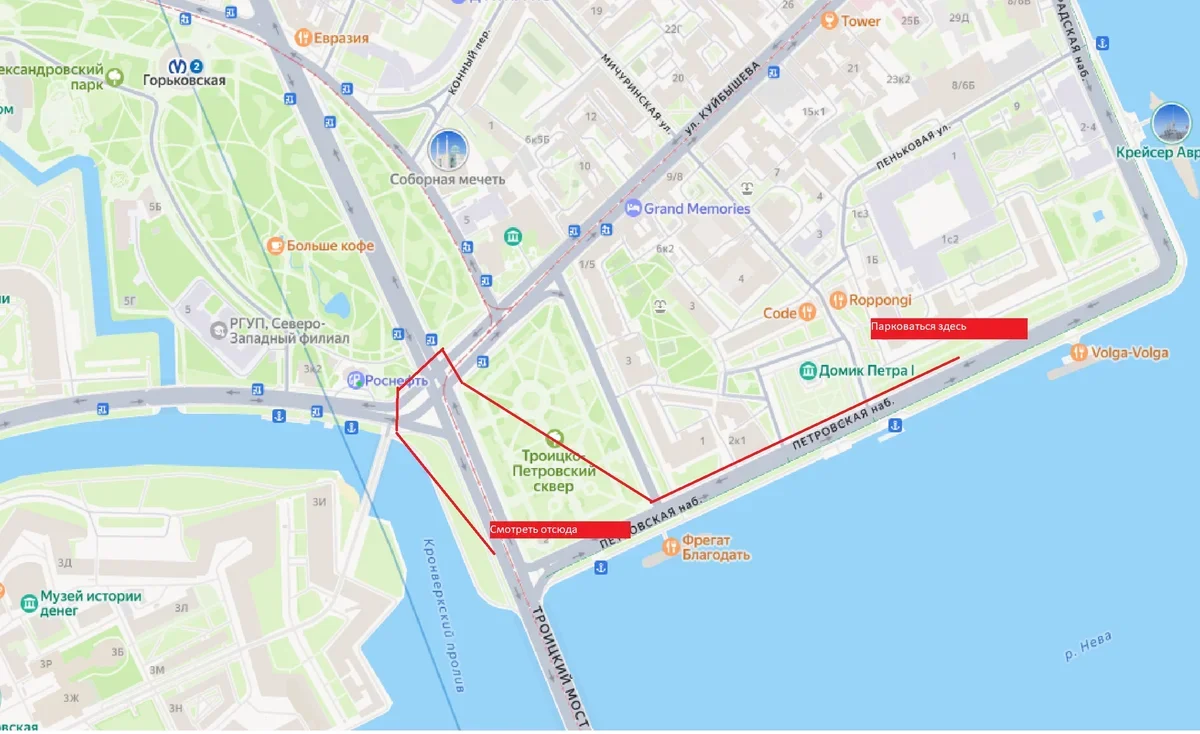Издалека, но на очень красивом фоне, на парусник можно посмотреть со въезда на Троицкий мост с Каменноостровского проспекта. Пешком отсюда легко дойти от Горьковской, машину же можно припарковать на Петровской набережной. Но дальше идти придется кругом – пешеходные переходы довольно далеко. Сюда приезжать лучше заранее – не только вы такие хитрые, это место довольно очевидно.