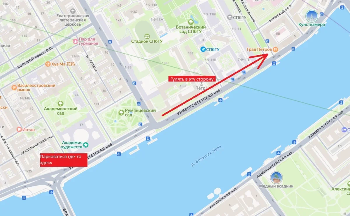 Второй оптимальный вариант – это Университетская набережная. Пешком – от метро Василеостровская. На машине надежнее всего парковаться у памятника Д.А, Трезини или на улицах рядом. Например, на 4-5 Линиях. Дальше – идти пешком мимо Сфинксов, Румянцевского сада, корпусов СПБГУ.